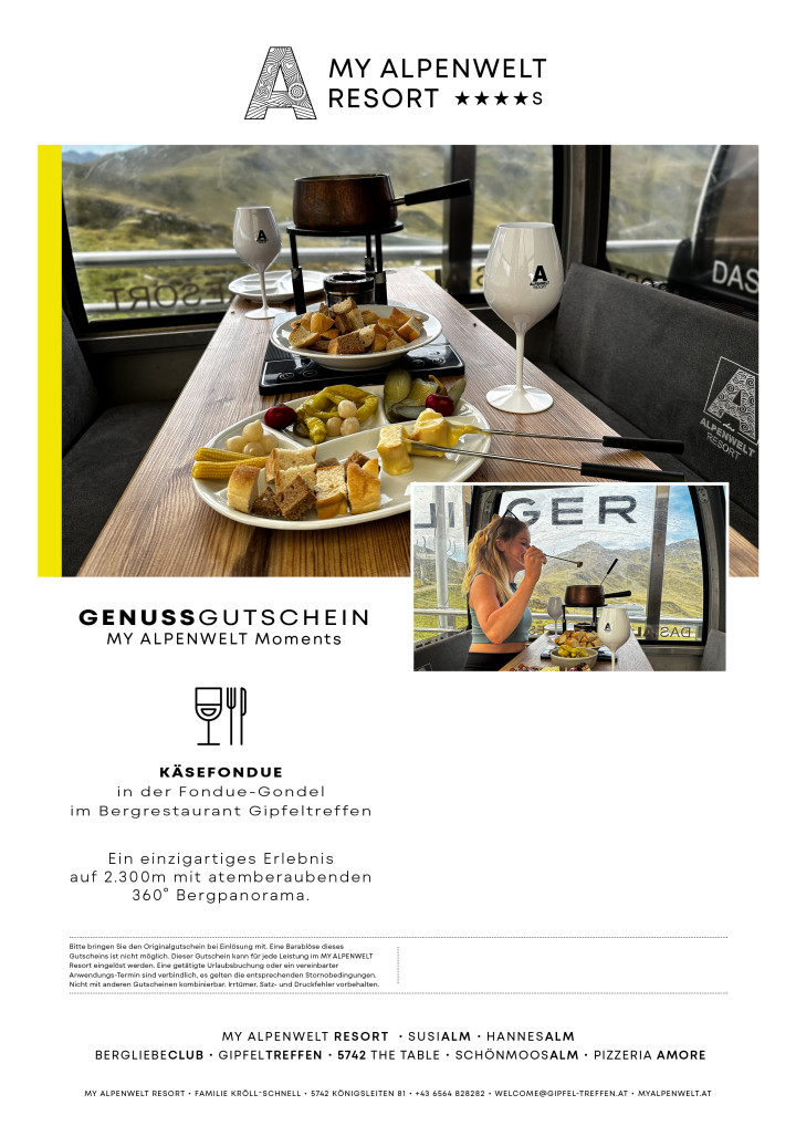 ALL WE NEED IS CHEESE Cheese fondue for 2 people Experience an ultimate taste adventure of melted cheese, accompanied by plenty of black & white bread, pan-fried potatoes, and pickled vegetables in our fondue gondola at the mountain restaurant Gipfeltreffen directly at the Dorfbahn Königsleiten. FINE PRINT • To be redeemed during the operating hours of the Dorfbahn • Price for 2 persons • Excluding mountain & valley rides • Excluding drinks • Price changes reserved